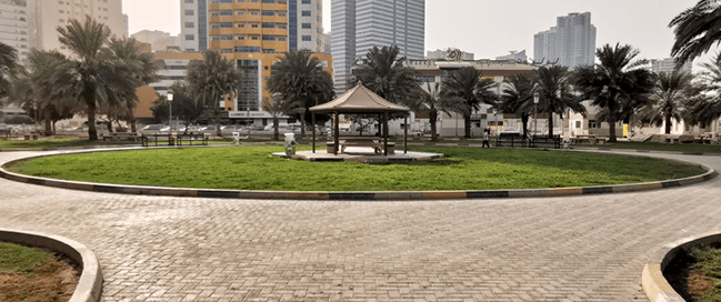 حديقة مجانية مناسبة للعائلات، تحتوي على مساحات خضراء واسعة، أشجار وزهور ملونة، ومسارات للدراجات وملاعب للأطفال، بالإضافة إلى مسجد ومرافق أمنية لضمان الراحة والأمان.