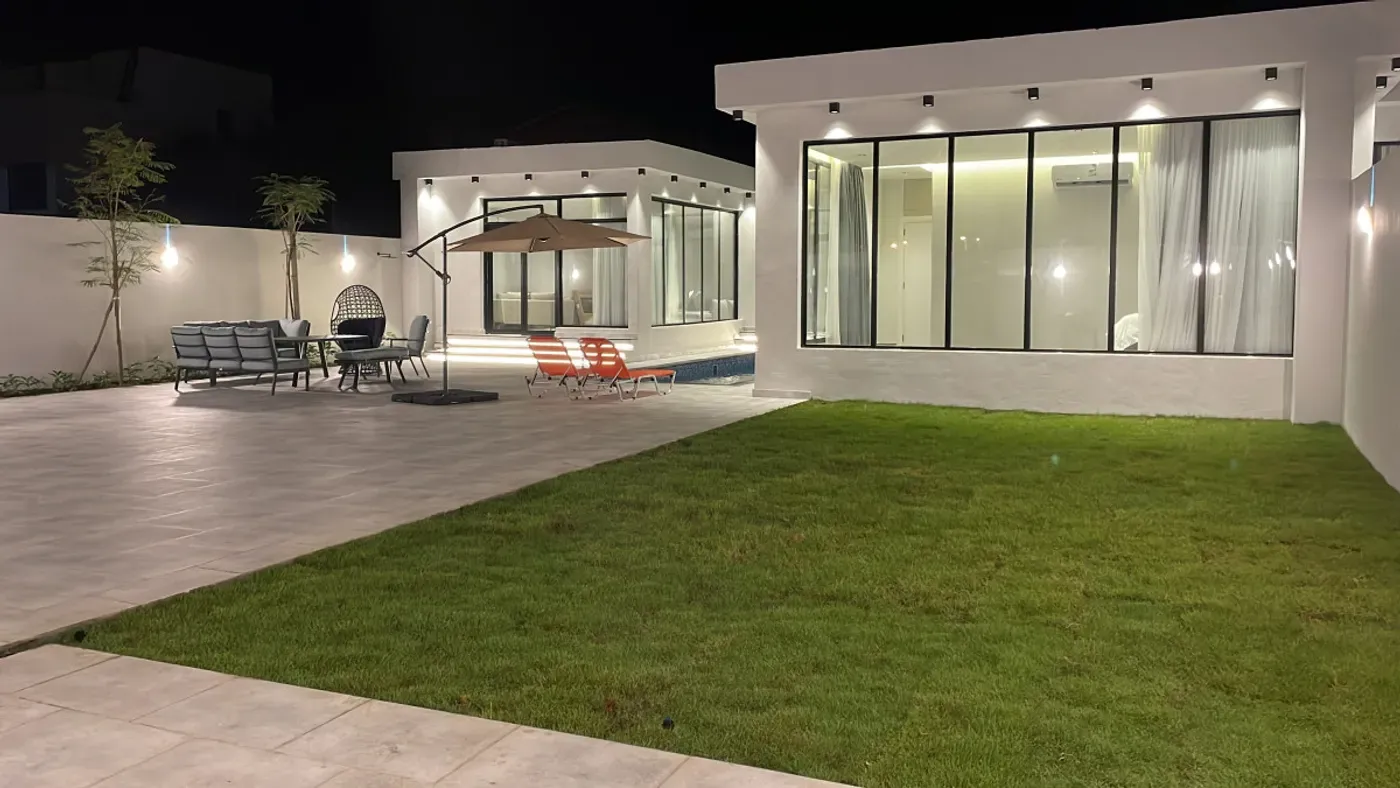 تتميز بتصميم عصري وجلسات خارجية لإقامة المناسبات، مع تجهيزات صوتية ومجالس فخمة للرجال.